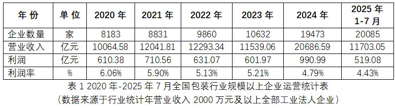 从表1的统计数据来看,截至2025年7月,全国规模以上包装企业数量是20085家,较2023年增加9453家,产能增量远高于市场需求增量,扩张积累的过剩产能已经成为加剧“内卷”的负担。企业总量庞大,头部企业较少,中小企业居多,产品与技术水平同质化严重,导致产能过剩。当产品缺乏差异性且不具备核心竞争力时,企业最容易陷入价格战内卷,有限的市场订单导致竞争异常激烈,行业利润率持续走低。